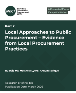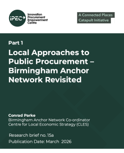 Part 1 Local approaches to public procurement – Birmingham Anchor Network revisited revisits earlier IPEC research on practising innovation in public sector procurement and examines how the Birmingham Anchor Network could take a shared, place-based approach to implementing the new legislation. Drawing on a cross institutional roundtable held in April 2025, it sets out the case for greater coordination across anchor institutions, including clearer definitions of barriers faced by SMEs and VCSEs, shared ambitions for local spend, and a more consistent understanding of what proportionate procurement means in practice.